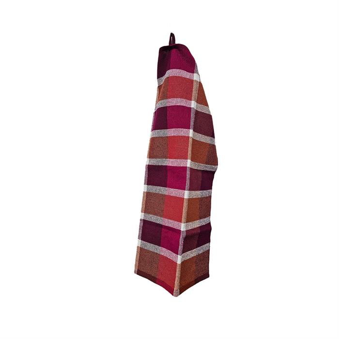 Dieses Handtuch wurde von unserer Mitarbeiterin Sarah gestaltet und gewoben. Die Kettfäden sind aus Cotonlin, ein Gemisch aus 60% Baumwolle und 40% Leinen. Die Schussfäden sind Bouclé-Garn aus 100% Baumwolle. Dessen frottee-ähnliche Struktur macht das Handtuch angenehm und saugfähig.